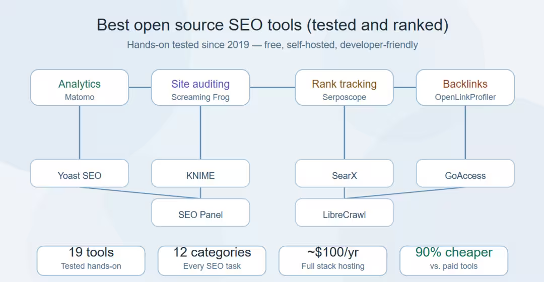 After testing 30+ open source alternatives since 2011, our team ranked the best ones by category — from Matomo for analytics to Serposcope for rank tracking. This guide covers real setup costs, honest limitations, and a complete free stack that replaces $2,400+ in annual subscriptions.