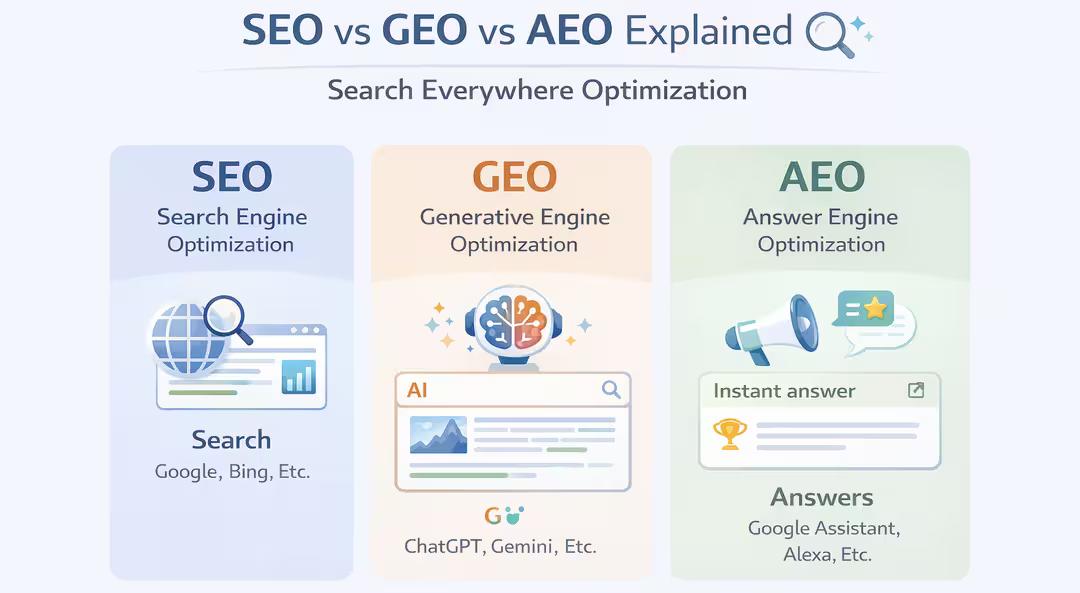 SEO gets you found. AEO gets you chosen. GEO gets you trusted. So, let's see how all three work together as layers of one strategy to get inbound leads.